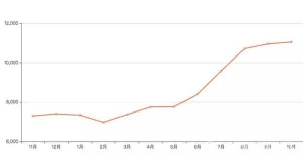 在多種因素的作用下,貴陽(yáng)房?jī)r(jià)開(kāi)啟狂奔模式。吉屋網(wǎng)的數(shù)據(jù)顯示,2018年10月,貴陽(yáng)的新房均價(jià)為11172元/平方米,而去年同期僅為7377元/平方米,一年時(shí)間內(nèi)漲幅超過(guò)50%。