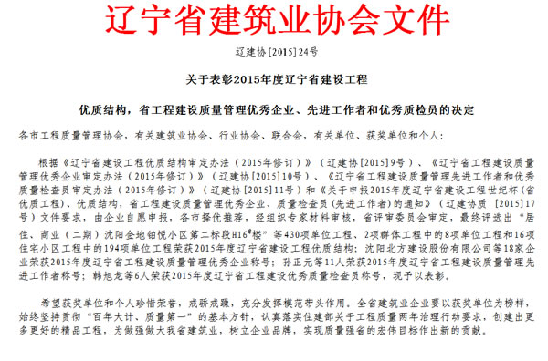 根據(jù)《遼寧省建設(shè)工程優(yōu)質(zhì)結(jié)構(gòu)審定辦法(2015年修訂)》(遼建協(xié)[2015]9號)、《遼寧省工程建設(shè)質(zhì)量管理優(yōu)秀企業(yè)審定辦法(2015年修訂)》(遼建協(xié)[2015]10號)文件精神,由企業(yè)自愿申報,市擇優(yōu)推薦審核,省評審委員會審定,遼寧綏四建設(shè)工程集團榮獲以下榮譽和獎項: 。ㄒ唬┻|寧綏四建設(shè)工程集團有限公司被評為2015年度遼寧省工程建設(shè)質(zhì)量管理優(yōu)秀企業(yè)。 。ǘ┘瘓F榮獲省優(yōu)質(zhì)主體結(jié)構(gòu)獎項工程: 1、綏中縣全民健身活動中心; 2、葫蘆島市龍港區(qū)兩河三村回遷樓改造二期一標(biāo)段1#樓; 3、葫蘆島市龍港區(qū)兩河三村回遷樓改造二期一標(biāo)段2#樓; 4、葫蘆島三和榮郡1#住宅樓; 5、葫蘆島三和榮郡2#住宅樓; 6、葫蘆島三和榮郡3#住宅樓; 7、葫蘆島三和榮郡4#住宅樓; 8、葫蘆島三和榮郡5#住宅樓; 9、葫蘆島三和榮郡6#住宅樓; 10、葫蘆島三和榮郡7#住宅樓; 11、葫蘆島三和榮郡8#住宅樓; 我集團將繼續(xù)認(rèn)真落實住建部關(guān)于工程質(zhì)量兩年治理行動要求,創(chuàng)建出更多更好的精品工程,樹立企業(yè)品牌,為做強做大遼寧省建筑業(yè)的宏偉目標(biāo)作出新的貢獻。