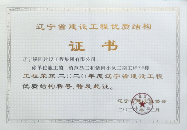 “葫蘆島三和恬園小區(qū)二期工程7#樓”榮獲2020年度遼寧省建設(shè)工程優(yōu)質(zhì)結(jié)構(gòu)稱(chēng)號(hào)