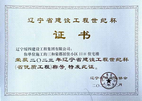 三和榮郡居住小區(qū)11#住宅樓 榮獲2023年遼寧省建設工程世紀杯(省優(yōu)質(zhì)工程)稱號